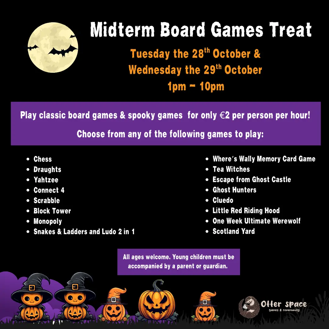 Looking to do something frighteningly fun for midterm? Try our Midterm Board Games Treat. For 2 days only, play a selection of classic and spooky games for only €2 per person per hour. It's a deal to die for 👻