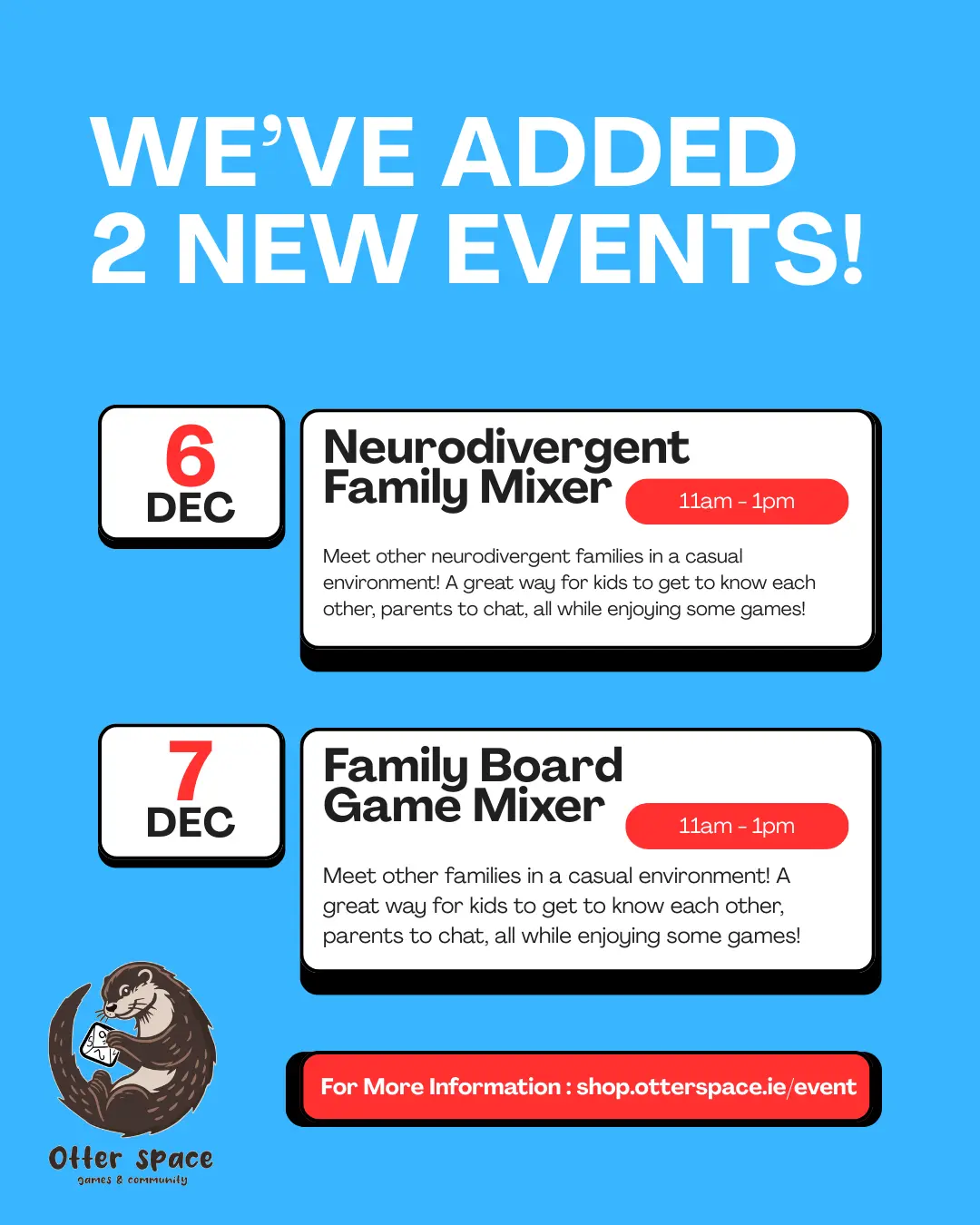 On Saturday, the 6th of December there is a Neurodivergent Family Mixer. It's a great way for children to get to know each other and parents to chat, all while enjoying some games! There are over 150 here to choose from, or people are welcome to bring their own games too.